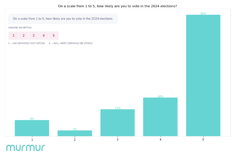 The results were pretty clear. 58% of our sample said that they would definitely vote, which was encouraging. The rest were either wavering or flat-out indicated that they would never vote. For these people, the main issue was a general malaise of disillusionment with the current political system.